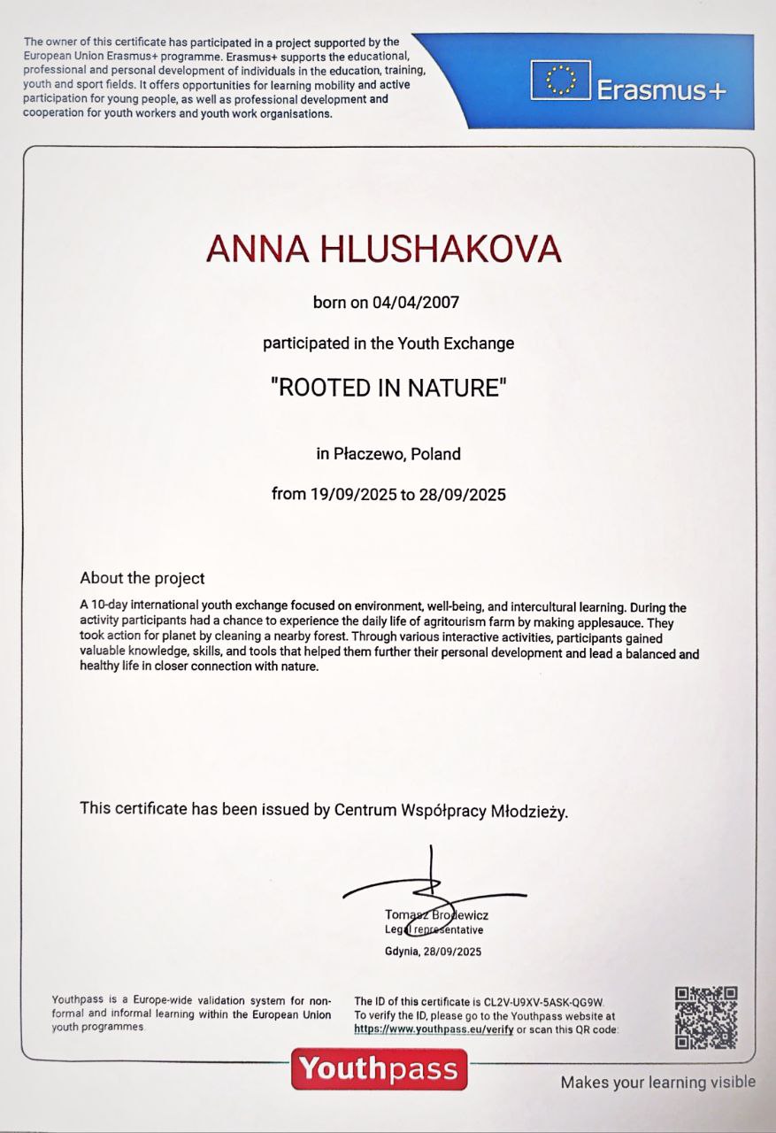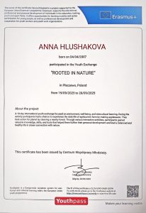 Здобувачки першого (бакалаврського) рівня вищої освіти Бекетова Софія (П-31Б), Дмитренко Тетяна (П-21Б) та Глушакова Анна (П-11Б) долучилися до молодіжного обміну «Rooted in Nature», що проходить з 19 по 28 вересня у Польщі. Програма спрямована на піклування про фізичне та ментальне здоров’я, відновлення зв’язку з природою, формування культури усвідомленого споживання їжі, підвищення екологічної свідомості, мінімізацію цифрової залежності, а також розвиток солідарності, взаєморозуміння та подолання стереотипів. Участь у такому заході є важливим кроком для студентської молоді на шляху до розширення світогляду, набуття міжнародного досвіду та формування активної громадянської позиції, що сприяє побудові більш екологічно відповідального й толерантного суспільства.