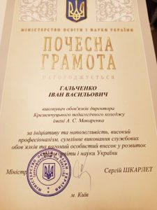 Почесними грамотами Міністерства освіти і науки України нагороджені радник директора Кременчуцького педагогічного коледжу імені А.С. Макаренка Іван Гальченко та завідуюча кафедрою інформаційних технологій Тетяна Лисенко.