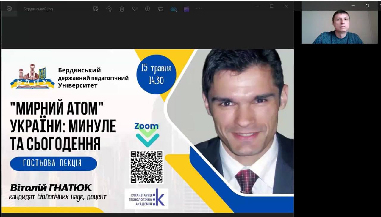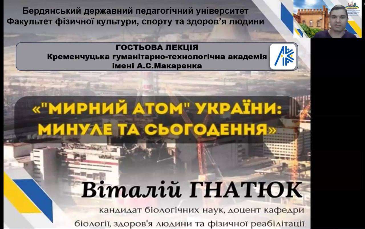 15 травня 2024 року доцент кафедри біології, здоров’я людини та фізичної реабілітації Бердянського державного педагогічного університету, кандидат біологічних наук Віталій Васильович Гнатюк, на запрошення Кременчуцької гуманітарно-технологічної академії імені А.С.Макаренка, провів гостьову лекцію на тему «Мирний атом України: минуле та сьогодення».