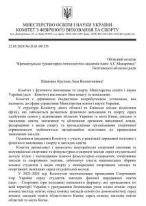 Активним, динамічним, завзятим і багатим на різноманітні спортивні події видався 2023-2024 навчальний рік. Свідченням цього є участь здобувачів освіти, батьків і викладачів у різноманітних фізкультурно-оздоровчих заходах, проєктах, спортивних змаганнях і турнірах. Але справжнім випробуванням сил і гарним стимулом до нових досягнень стала участь збірних команд коледжу у змаганнях Спортивних ігор із волейболу, баскетболу 3х3, мініфутболу, настільного тенісу, шахів. Крім того, наш коледж став спортивною базою для проведення зональних і обласних змагань Спортивних ігор Полтавщини із різних видів спорту серед студентської молоді ЗФПО. Голова Комітету із фізичного виховання і спорту МОН України Вадим СТЕЦЕНКО висловлює подяку директору Обласного коледжу “Кременчуцька гуманітарно-технологічна академія імені А.С.Макаренка” Лесі КРУПІНІЙ за сприяння розвитку фізичної культури та спорту в закладі освіти й залучення студентської молоді до рухової активності.