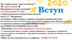 Продовжено вступну кампанію на базі 9 класів до Кременчуцького педагогічного коледжу імені А.С. Макаренка