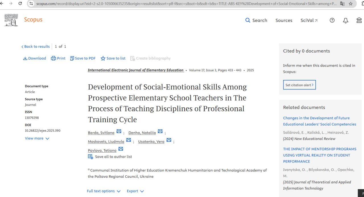Назва статті: “Development of Social‑Emotional Skills among Prospective Elementary School Teachers in The Process of Teaching Disciplines of Professional Training Cycle”