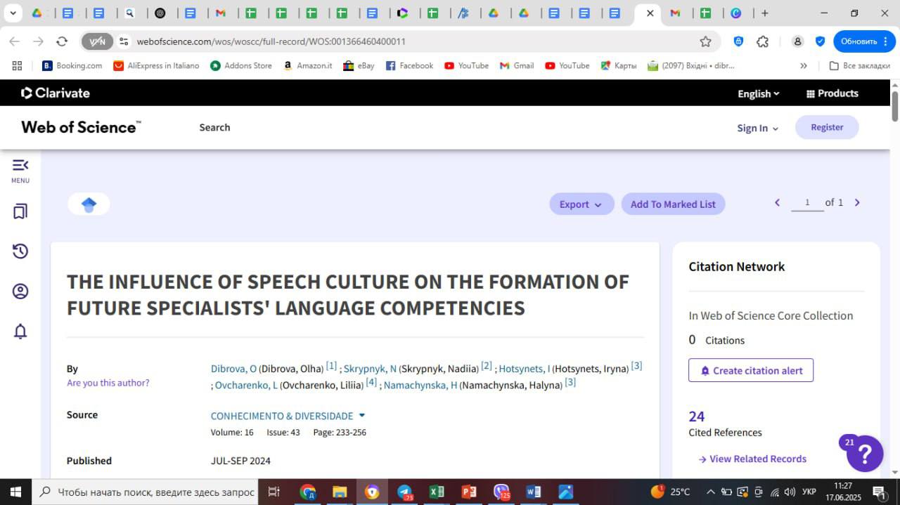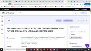 У процесі науково-дослідної діяльності кандидат філологічних наук, доцент кафедри початкової освіти, гуманітарних дисциплін та інформатики Комунального закладу вищої освіти «Кременчуцька гуманітарно-технологічна академія» Полтавської обласної ради Ольга ДІБРОВА та кандидат філологічних наук, старший викладач, спеціаліст вищої категорії, викладач-методист, завідувач кафедри української філології Комунального закладу вищої освіти «Вінницький гуманітарно-педагогічний коледж» Надія СКРИПНИК виступили співавторами статті THE INFLUENCE OF SPEECH CULTURE ON THE FORMATION OF FUTURE SPECIALISTS’ LANGUAGE COMPETENCIES, опублікованої у виданні, що індексується в базі Web of Science. Стаття присвячена актуальній темі модернізації підготовки фахівців мовних спеціальностей у контексті цифровізації вищої освіти.