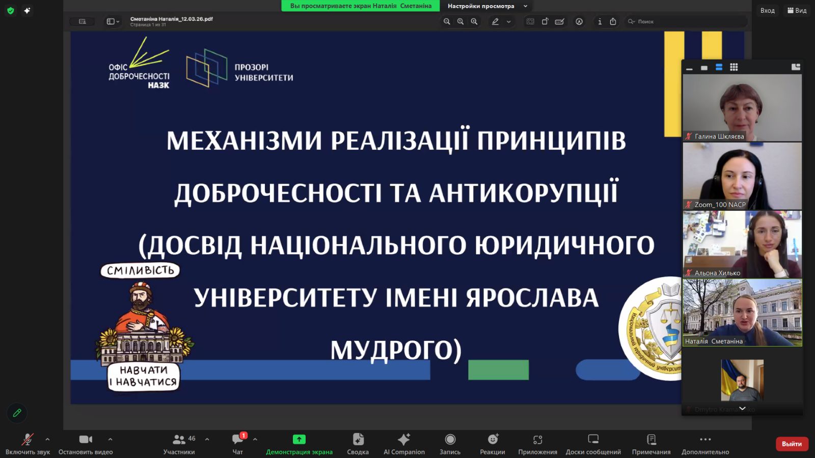 12 березня 2026 року науково-педагогічні та педагогічні працівники Комунального закладу вищої освіти „Кременчуцька гуманітарно-технологічна академія” долучилися до заходу в межах проєкту „Прозорі університети”, ініційованого Офісом доброчесності НАЗК „Доброчесність у закладах вищої освіти: практики та досвід”.