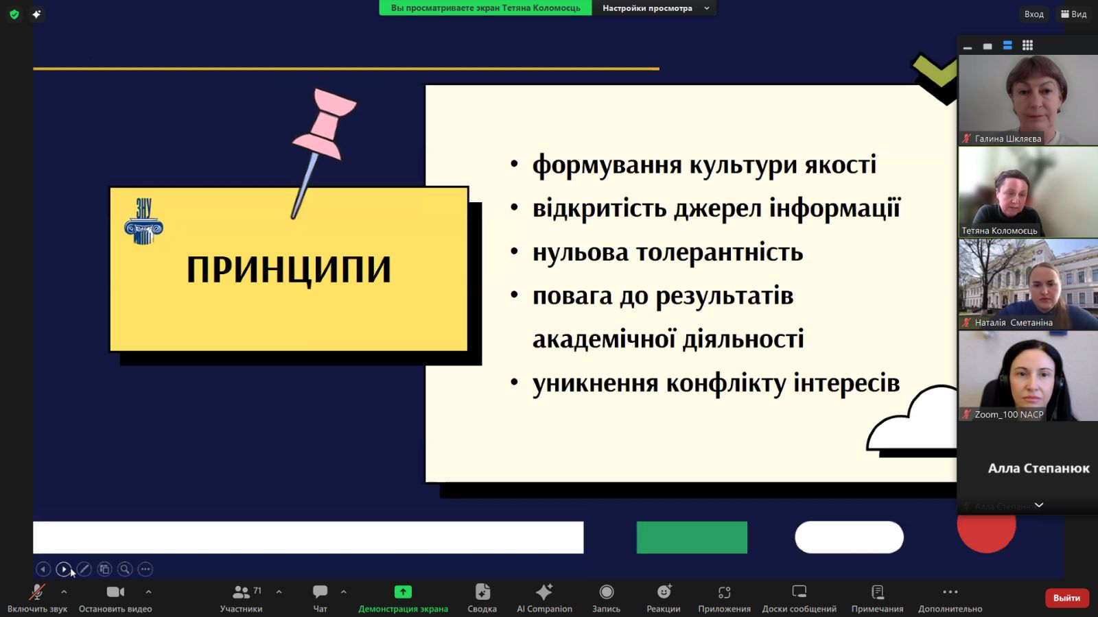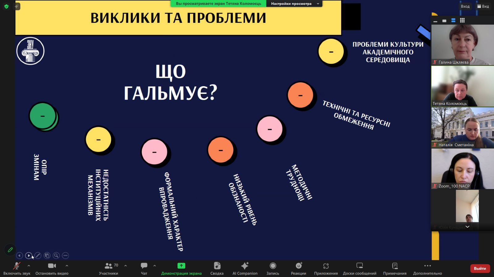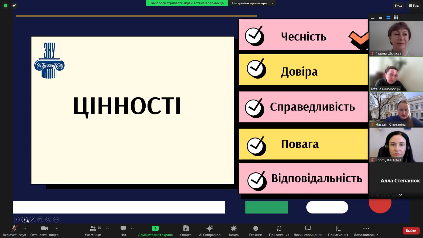 Під час заходу учасники ознайомилися з реальними прикладами інтеграції теми доброчесності у навчальний та науковий процес, дізналися про перевірені підходи та механізми запобігання недоброчесній поведінці.