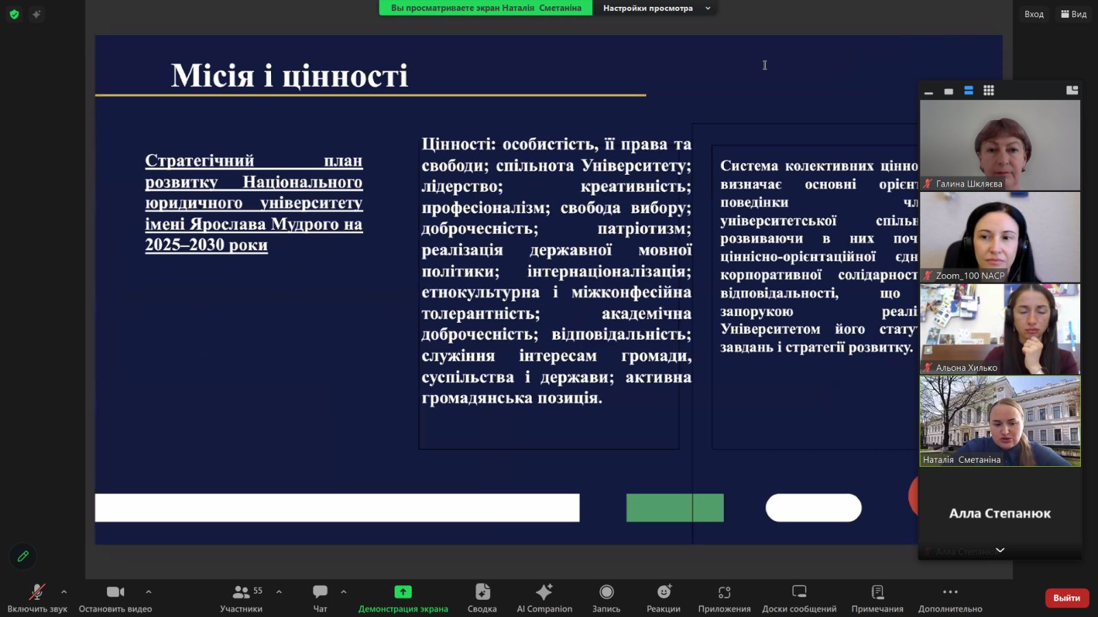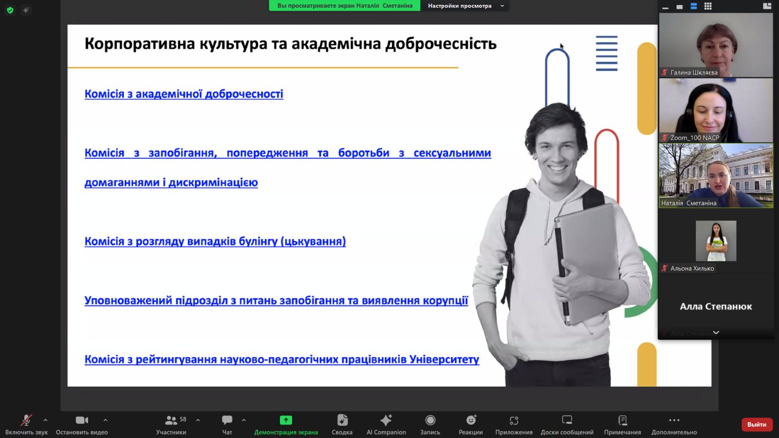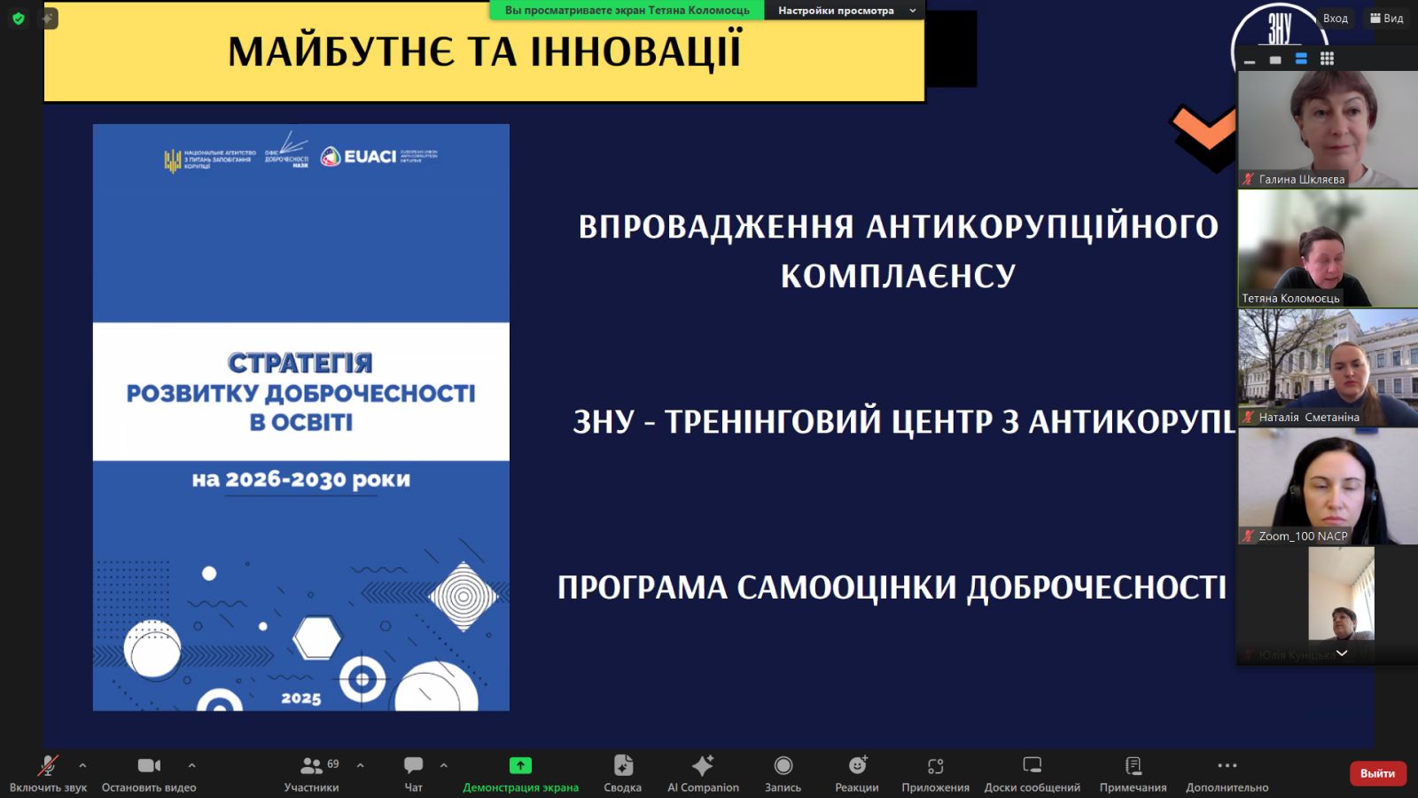 Спікери заходу, Наталія СМЕТАНІНА, кандидат юридичних наук, доцент кафедри кримінально-правової політики, керівник уповноваженого підрозділу з питань запобігання та виявлення корупції Національного юридичного університету імені Ярослава Мудрого та Тетяна КОЛОМОЄЦЬ, доктор юридичних наук, професор, член-кореспондент НАПрН України, Заслужений юрист України, декан юридичного факультету Запорізького національного університету розкрили ключові елементи формування етичної культури та запобігання корупції, що ґрунтуються на інтеграції використання антикорупційних інструментів, навчання студентів і розвитку корпоративної культури закладів вищої освіти.