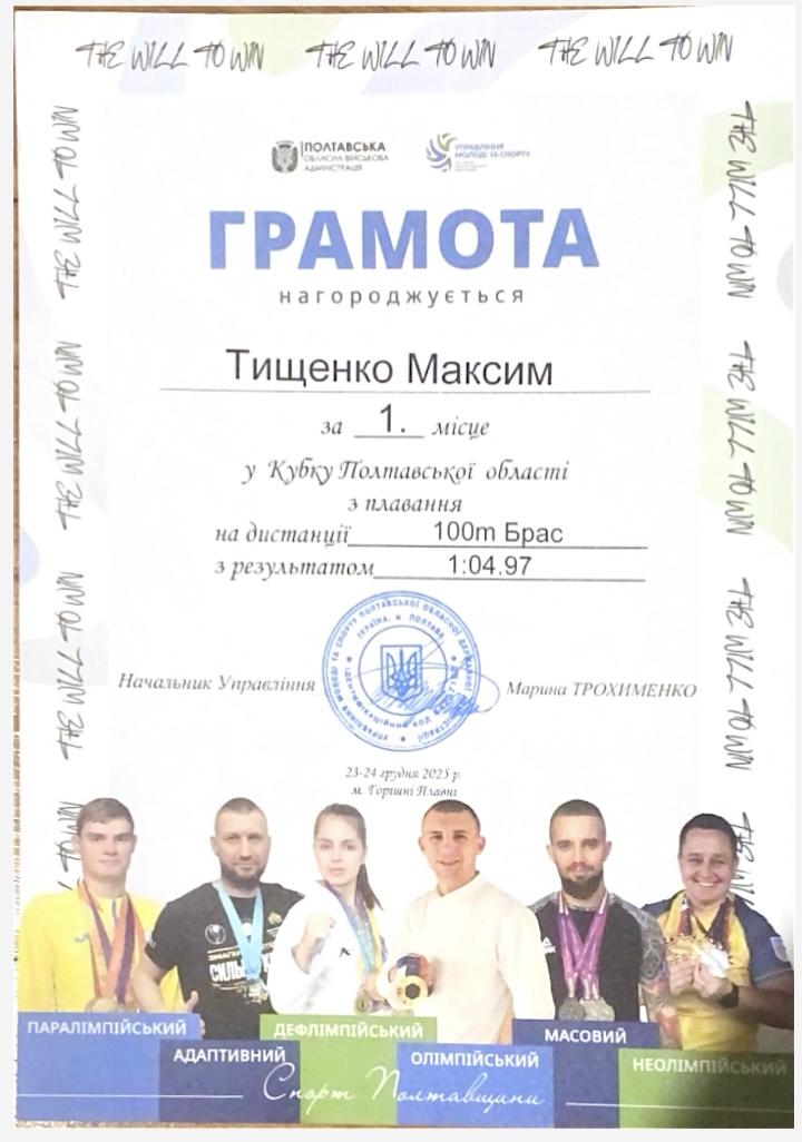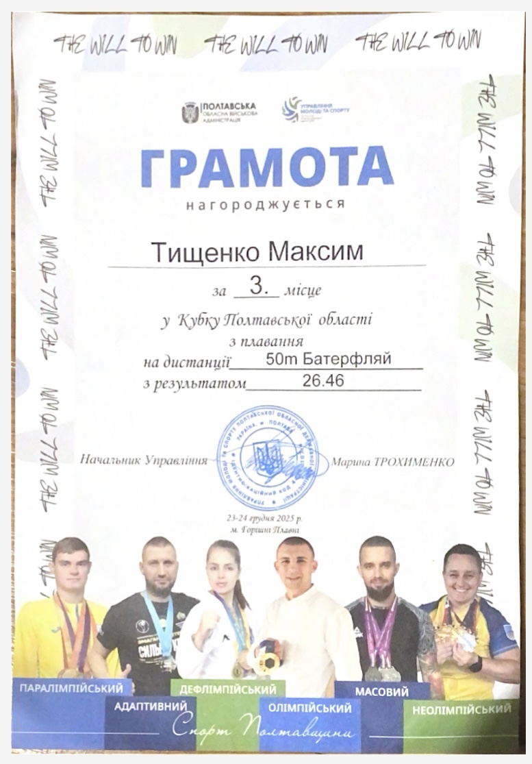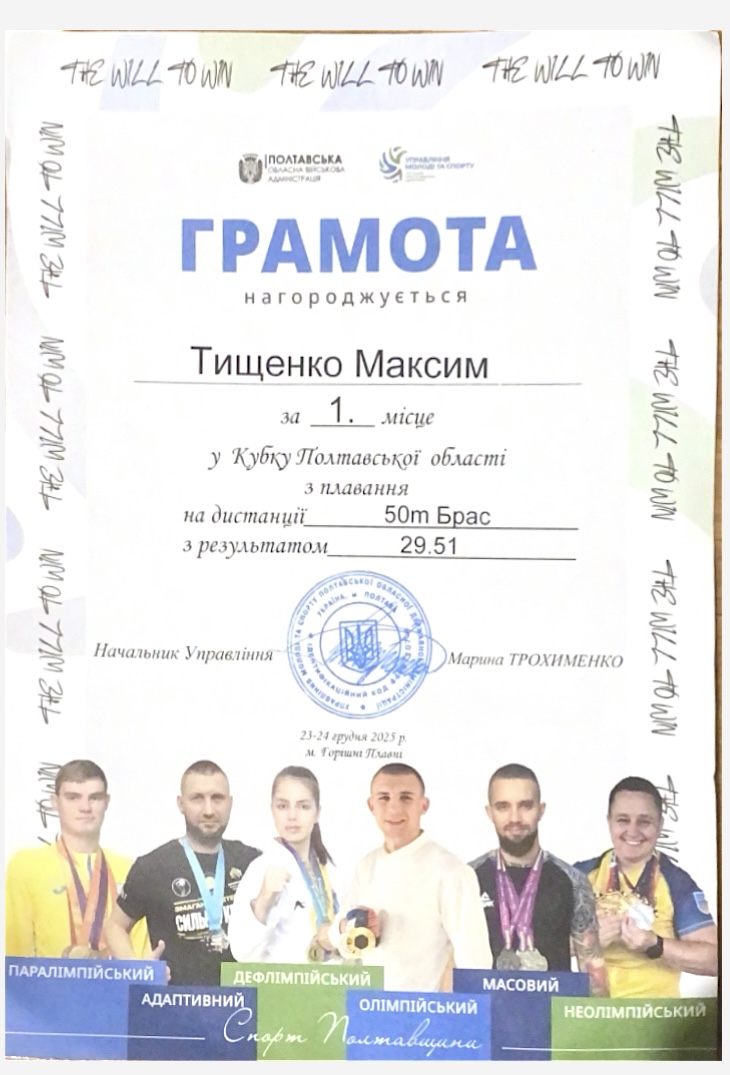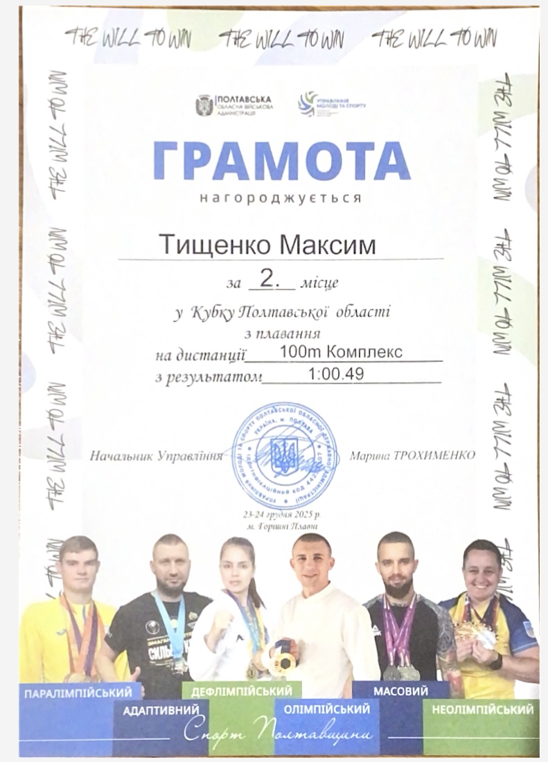 Щиро вітаємо студента групи ФК–41Б ТИЩЕНКА Максима з успішною участю в Кубку Полтавської області з плавання! Це був потужний заплив!