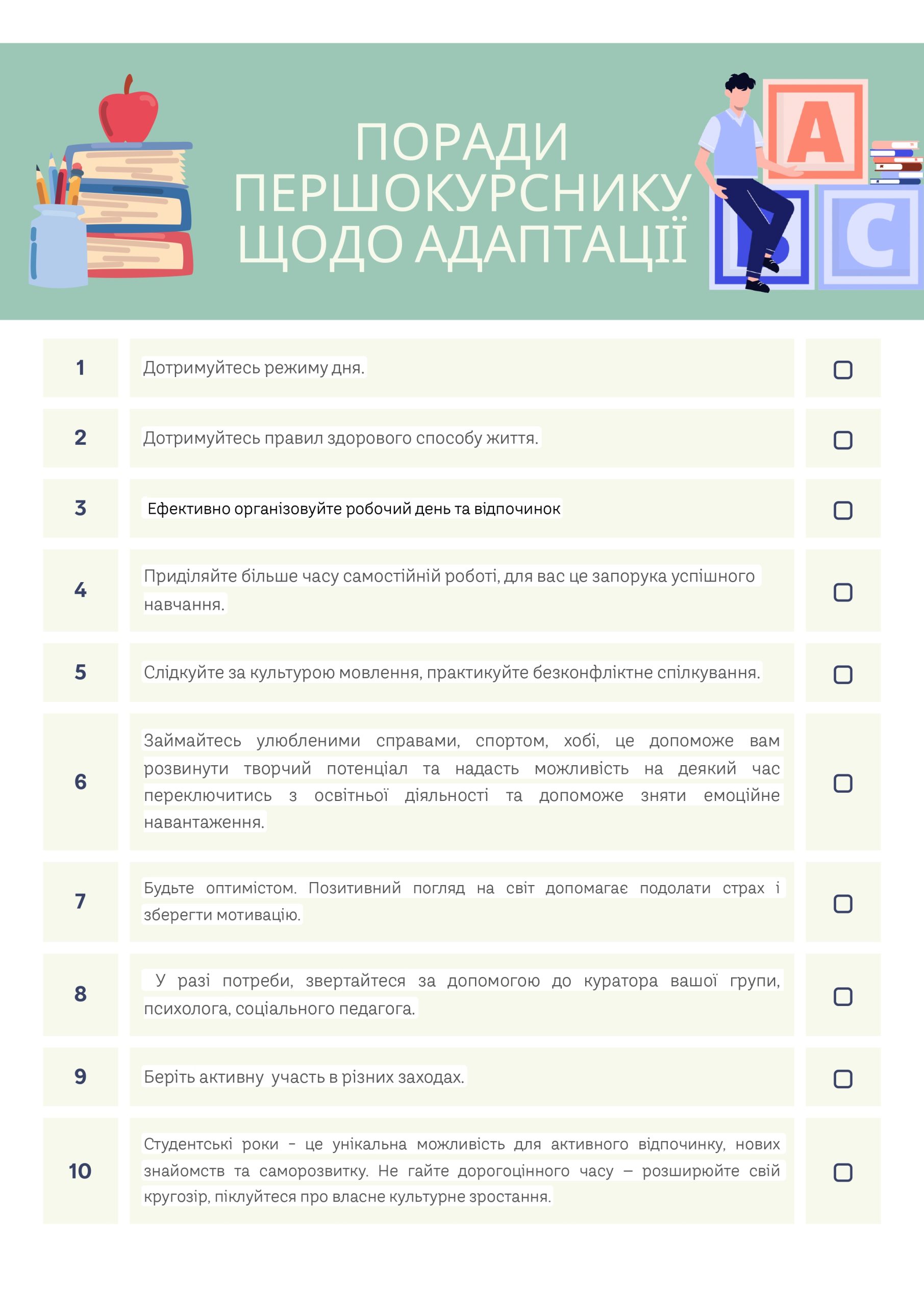 Соціальна адаптація студентів-першокурсників Поради студентам-першокурсникам Заходи із соціальної адаптації