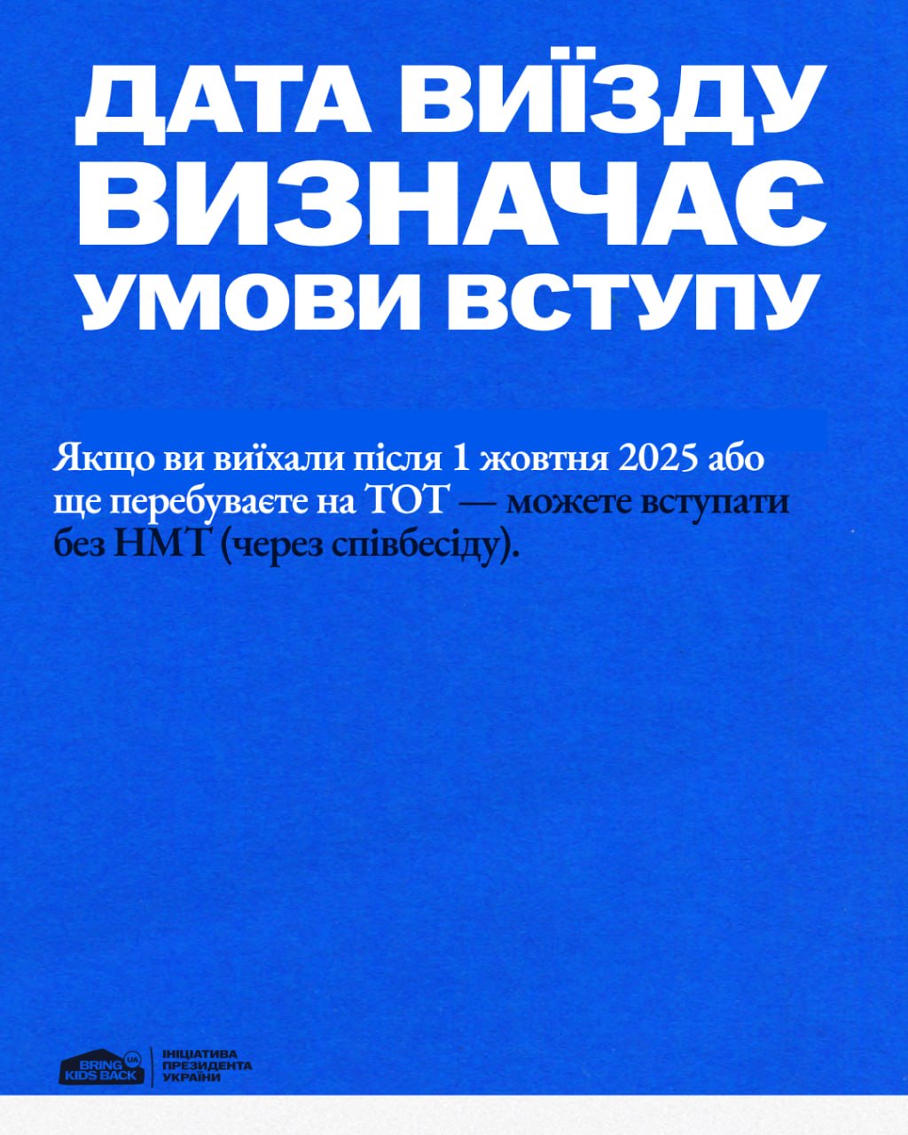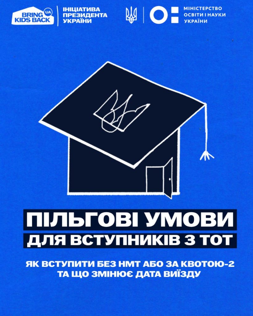 Якщо ви досі перебуваєте на ТОТ або виїхали після 1 жовтня 2025 року — вступ можливий без НМТ, через співбесіду в університеті. Якщо виїзд був раніше — потрібні результати НМТ, але діє квота-2.