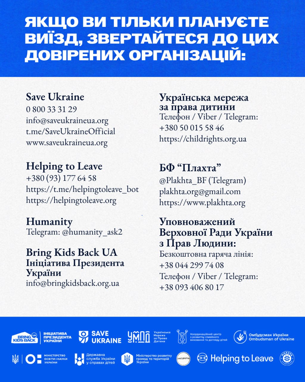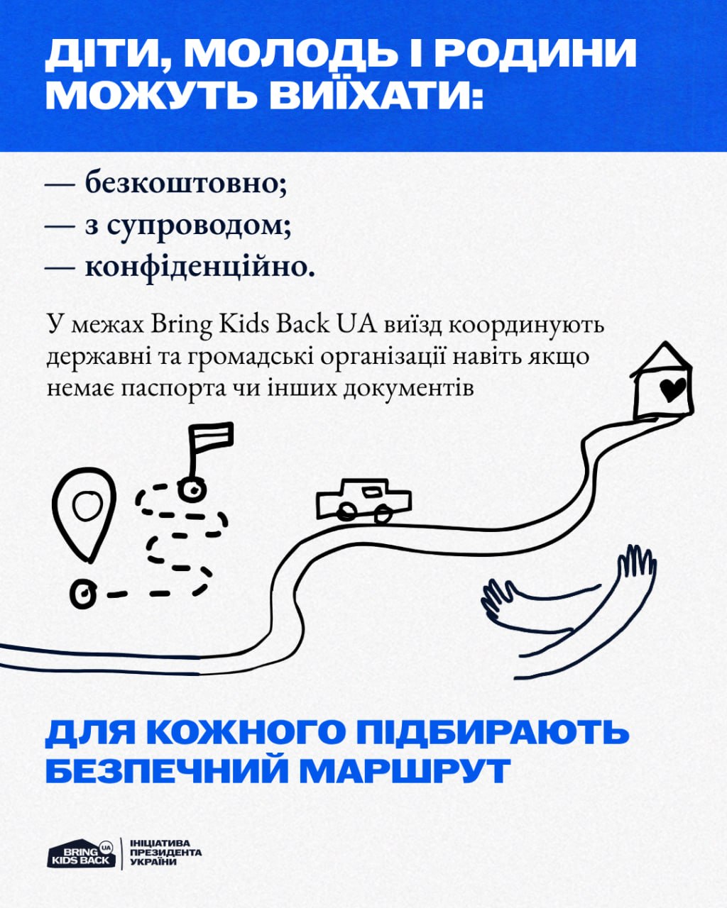 Якщо ви тільки плануєте виїзд — звертайтеся. У межах ініціативи Bring Kids Back UA допомагають виїхати безкоштовно, конфіденційно та з повним супроводом — навіть якщо немає документів. Для кожного підбирають безпечний маршрут.