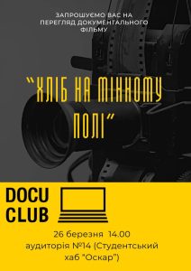 Весна – час нових сподівань, відродження надій на майбутнє і початок польових робіт, які для українців мають не тільки прагматичне, а й, без перебільшення, сакральне значення. Проте не у всіх регіонах України поле – простір безпеки та майбутнього добробуту. Саме про це йдеться в документальному фільмі «Хліб з мінного поля: випробування війною та сила єдності», який сьогодні переглянули студенти й викладачі Академії в межах проєкту DOCU CLUB.