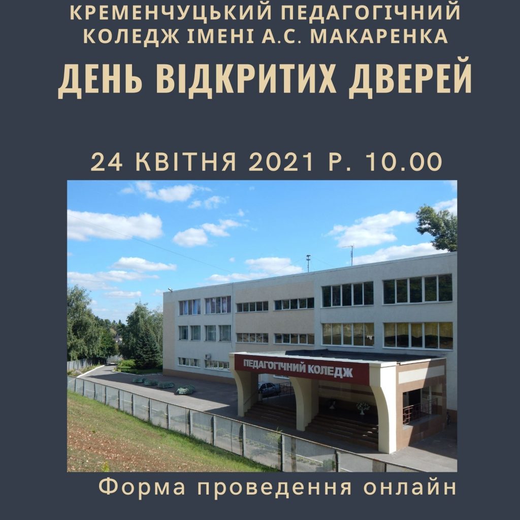 Кременчуцький педагогічний коледж імені А.С. Макаренка запрошує випускників 9-х та 11-х класів 24.04.2021 р. о 10.00 на День відкритих дверей. Форма проведення – онлайн. https://forms.gle/6JfthxretaekrANk6 22.04 – 23.04.2021 р. на вказані Вами контактні дані надійде запрошення на ZOOM – конференцію.